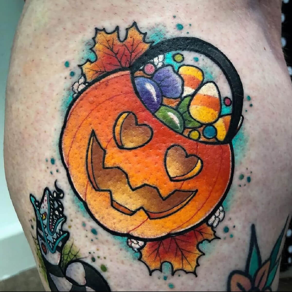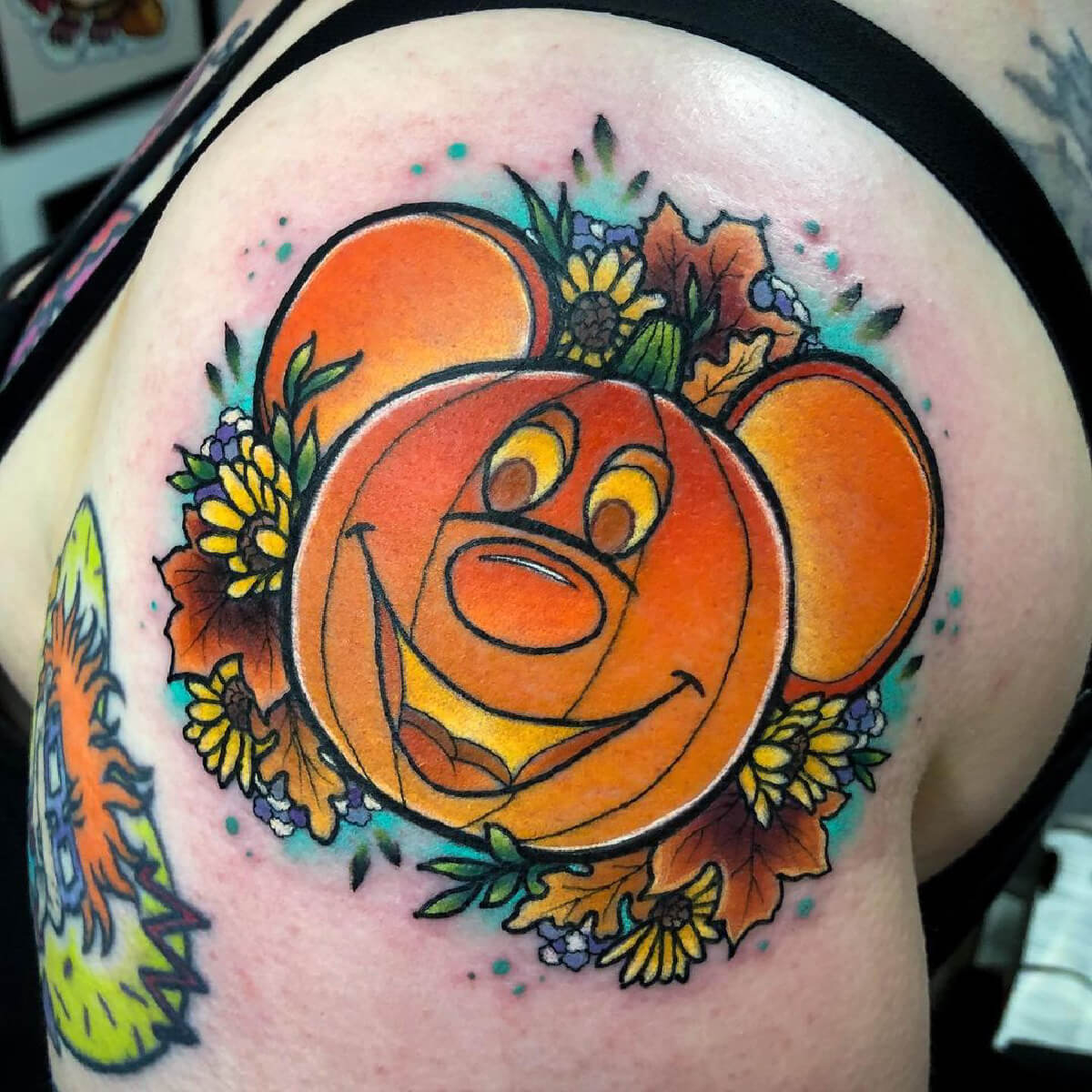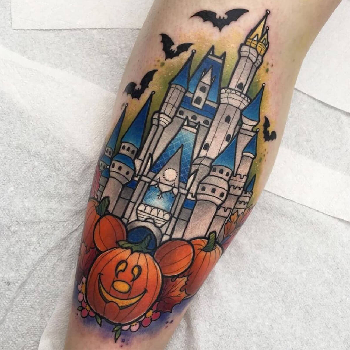 Ich liebe es, süße Motive in Halloween-inspirierte Designs zu verwandeln, wie Disney-Figuren, Waldtiere oder kleine Geister. Wenn ich mich für eines entscheiden müsste, denke ich an ein großes Disney-Schloss, das ich tätowiert habe, umgeben von Kürbissen und kleinen Fledermäusen – das hat unglaublich viel Spaß gemacht!