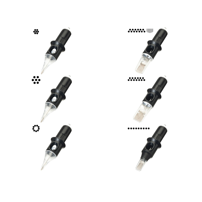 Cheyenne Safety Nadelmodule sind schnell austauschbar und verfügen über eine integrierte Membran, die Farbe und Blut im Modul hält und vom Griff fernhält. Die Nadeln des Moduls ragen aus der Spitze heraus, wenn der federbelastete Nadelstangenkolben eingedrückt wird, und die Nadeln ziehen sich einfach wieder in ihre normale Ausgangsposition zurück, wenn der Druck nachlässt, wodurch eine sichere und einfache Entsorgung möglich ist.