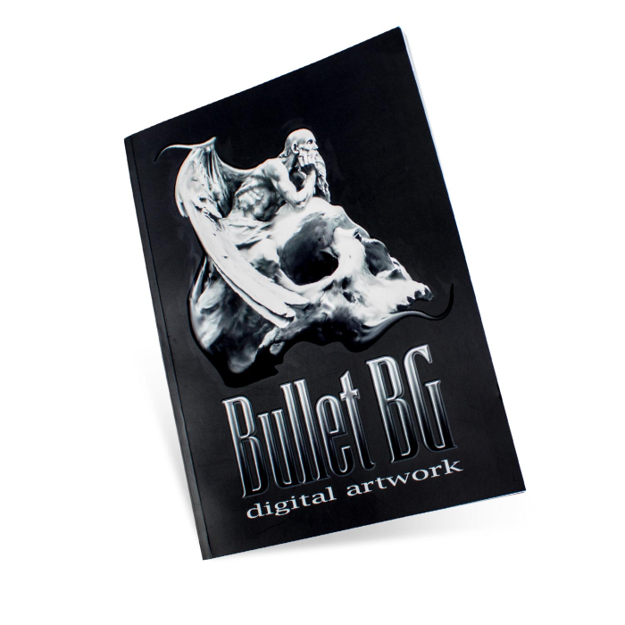Browse through Bullet BG's book of 50 original digital artwork design for tattoos. Including war, death, human faces, religion and mythology, see how Bullet BG is able to manipulate his images in to amazing digital artwork.