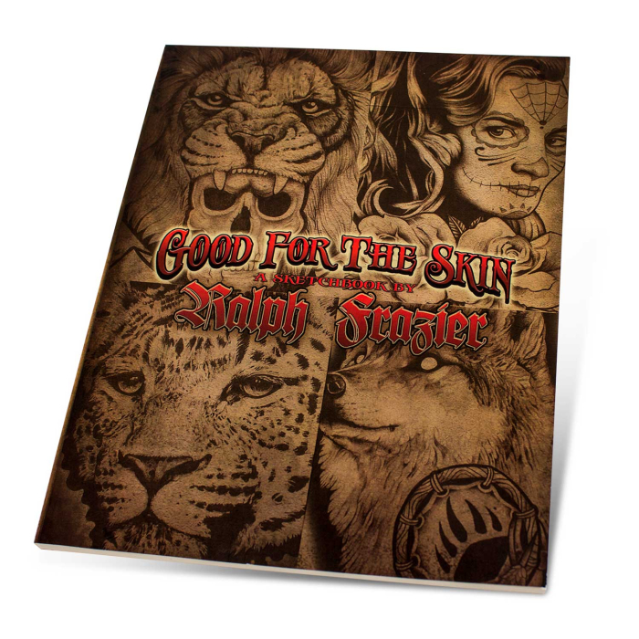 Good for the Skin von Ralph Frazier enthält 40 einseitig bedruckte Seiten mit Black&Grey Werken. Das Buch ist als Anregungsquelle für Tätowierer gedacht. Die Bilder sind auf cremefarbenem Karton gedruckt. Ralph macht eine Lehre bei Stinky Monkey Tattoos.