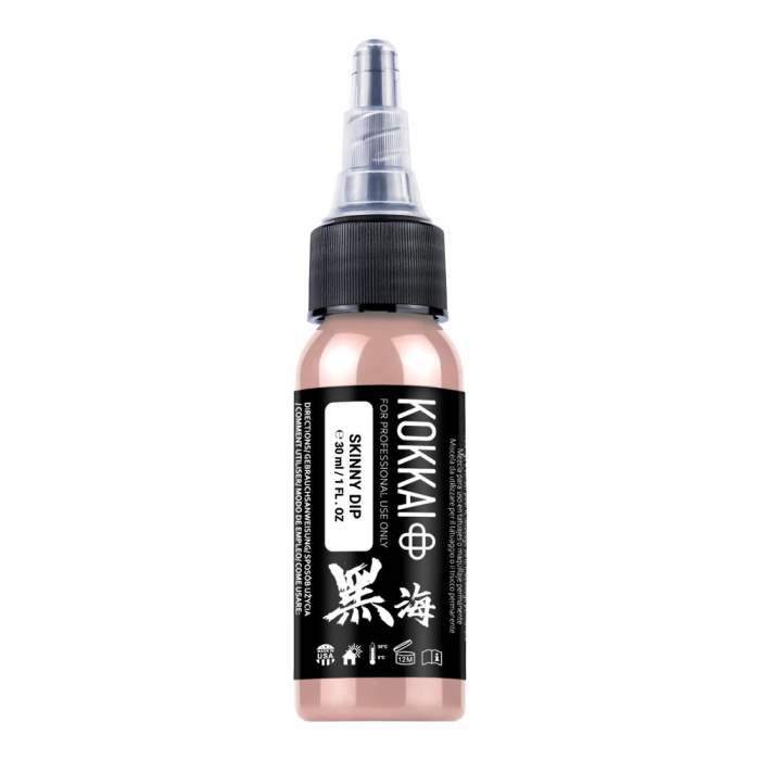 Achieve realistic skin tones with Kokkai Sumi Ink in Skinny Dip, a soft, flesh-tone pink perfect for portrait and realism tattoos. Ideal for creating smooth gradients, soft blushes, shading, and highlights.