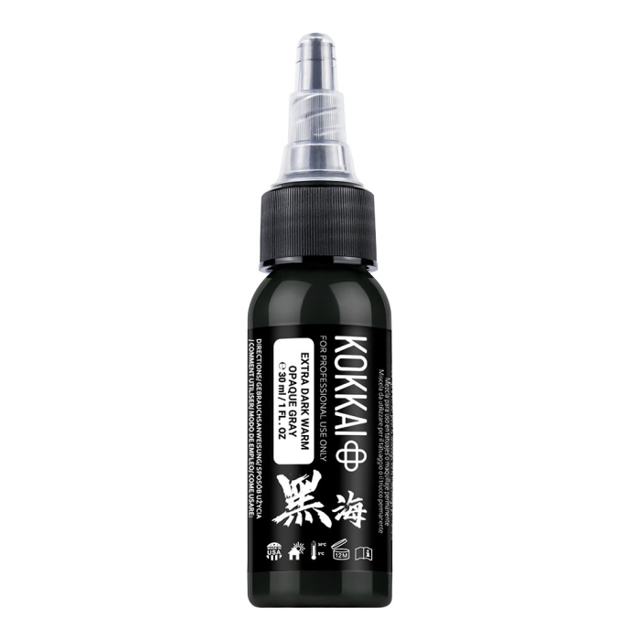 Enhance tattoos with Kokkai Sumi Ink in Extra Dark Warm Opaque Grey, part of a 5-shade set designed to bring depth, warmth, and softness to your tattoos. Infused with white for a creamy opaque finish, these warm-toned greys are perfect for portraits, realism, black and grey work, and organic elements in designs.