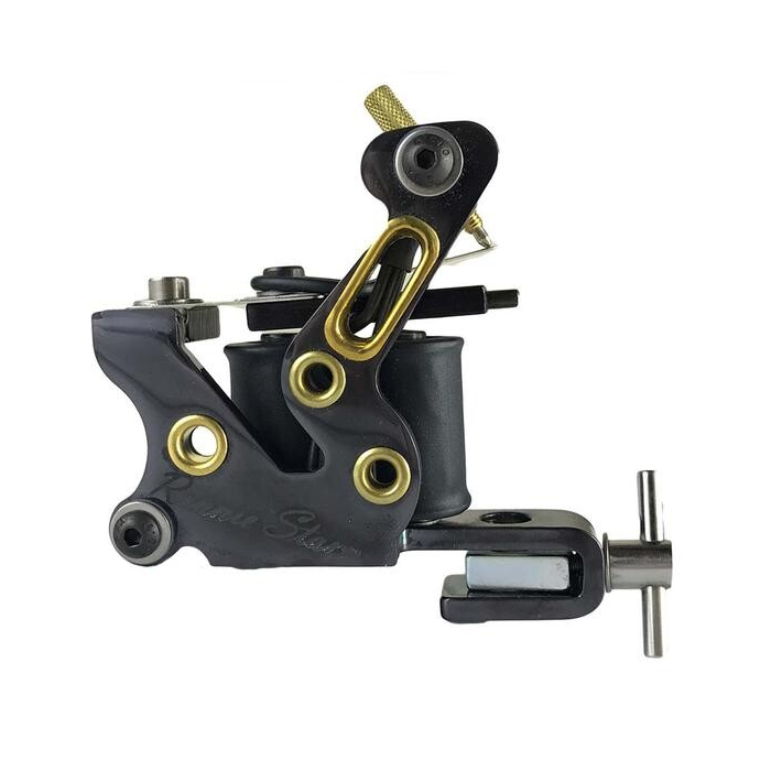 Ronnie Starr hat alles getan, um sicherzustellen, dass seine Maschinen so gleichmäßig, wie möglich laufen: Der Rahmen ist aus verchromtem Stahl und ist perfekt ausbalanciert. Die Armaturbar, Spulenkerne und der Amboss sind aus Schmiedeeisen gefertigt, das sehr gute magnetische Fähigkeiten besitzt. Die Spitze der Kontaktschraube ist aus Silber, was die elektrische Leitfähigkeit verbessert und für eine verlustfreie Spannung sorgt.