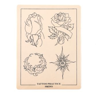 Die Übungshaut aus Gummi ist perfekt geeignet, um verschiedene Tattoodesigns auszuprobieren, bevor man versucht, auf menschlicher Haut zu stechen . Beispieldesigns aufgedruckt: Blumenmotive. Abmessungen sind ca. 21cm x 15cm.