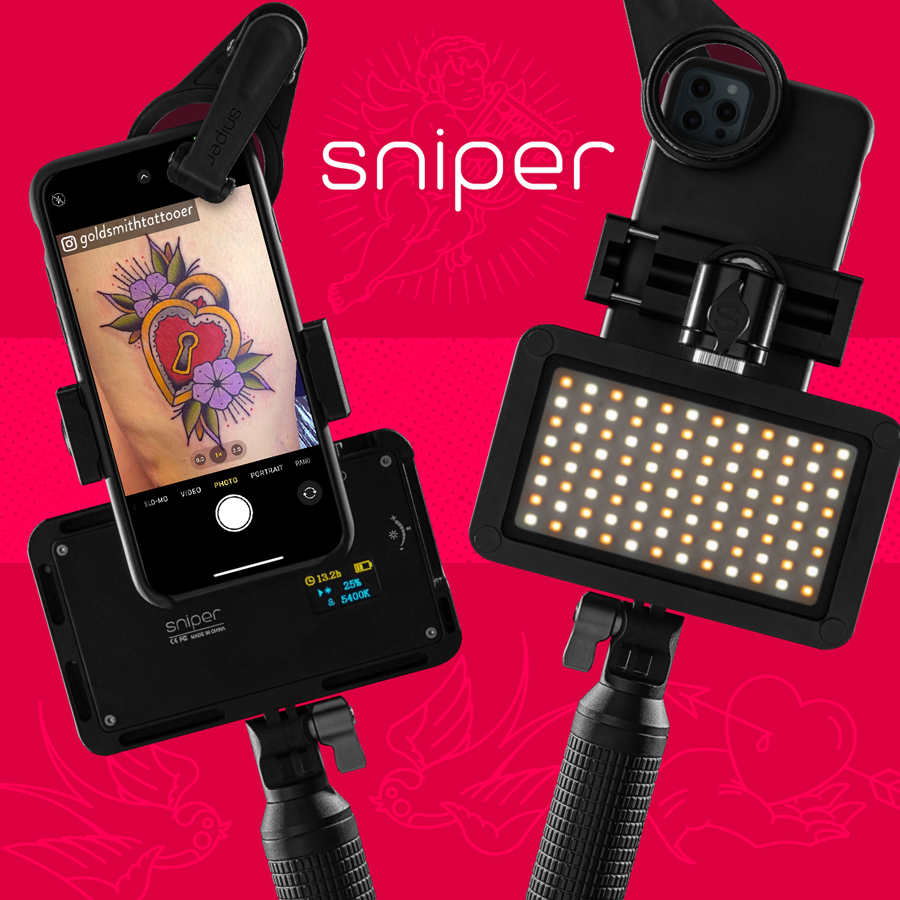 Das Gewinnerduo erhält jeweils ein Sniper Tattoo Photography Set, das eine tragbare Smartphone- und Kamerahalterung hat, als auch mit einem Telefonclip-Objektiv und einem LED-Lichtpanel kombiniert ist, sodass Sie beide unglaubliche Fotos von Ihrer Arbeit machen können!!